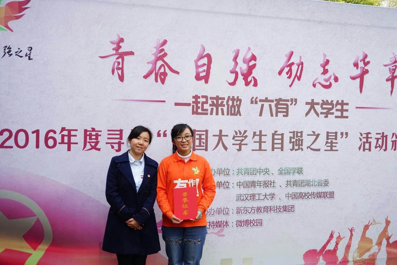 3月31日,2016“中国大学生自强之星标兵”颁奖典礼在武汉理工大学礼堂举行。团中央书记处书记傅振邦、新东方教育科技集团董事长俞敏洪、湖北省政府副秘书长聂昌斌、共青团湖北省委书记张桂华、武汉理工大学党委书记信思金、团中央学校部副部长宋来、中国青年报副总编辑董时、共青团湖北省委副书记金鹏、武汉理工大学党委副书记赵经、新东方教育科技集团助理副总裁、武汉新东方学校校长孔建龙出席参加了本次典礼。