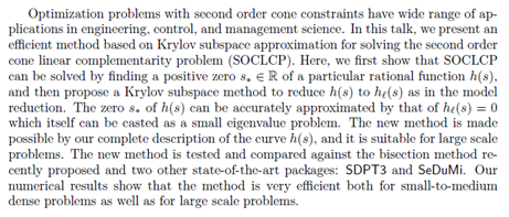 报告题目 | A Krylov Subspace Method for Large-Scale Second-Order Cone Linear Complementarity Problem | ||