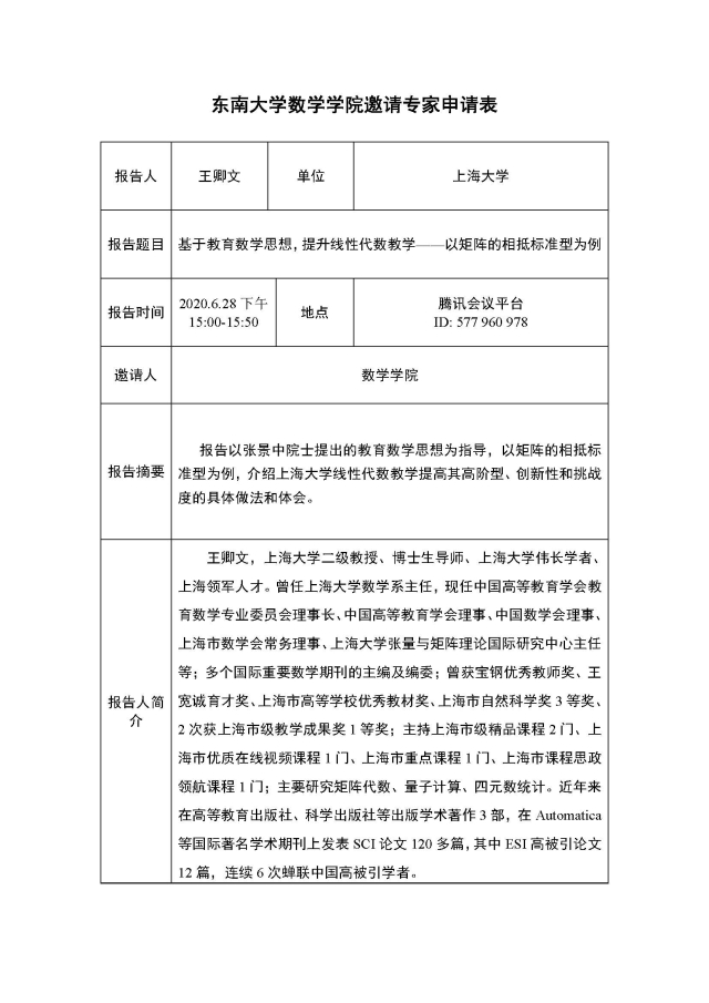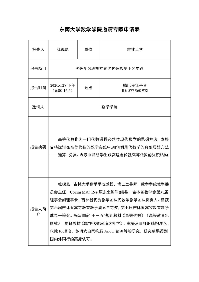 学术报告:2020年6月28日14:00-16:50,高等代数论坛