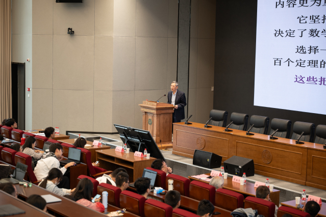 在学术报告环节,席南华院士在综合楼301报告厅以《几何——从熟悉到陌生》为题作报告。席院士从欧式几何的影响出发,详细介绍了几何学的发展历程,用平实的语言和生动的比喻,揭示了数学的内在逻辑与无穷魅力,为全校300余名师生带来一场兼具理论深度与思维启发性的讲座。